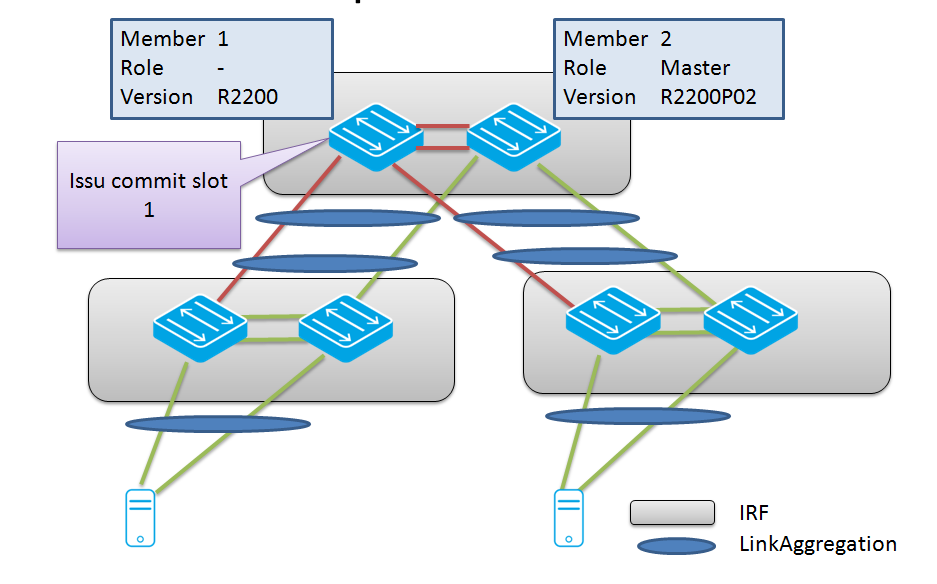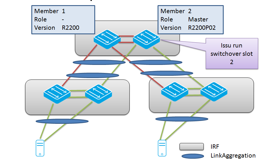 Suppose the R2200P02 would cause some OSPF or STP problem on the network. The admin will need to install and run R2200 again on the system. Since the member 1 is now booted with the old R2200 as slave, it would be sufficient to reboot the member 2 (current R2200P02 master). This would cause the member 1 to become master again, running R2200. This step is known as the ISSU rollback.