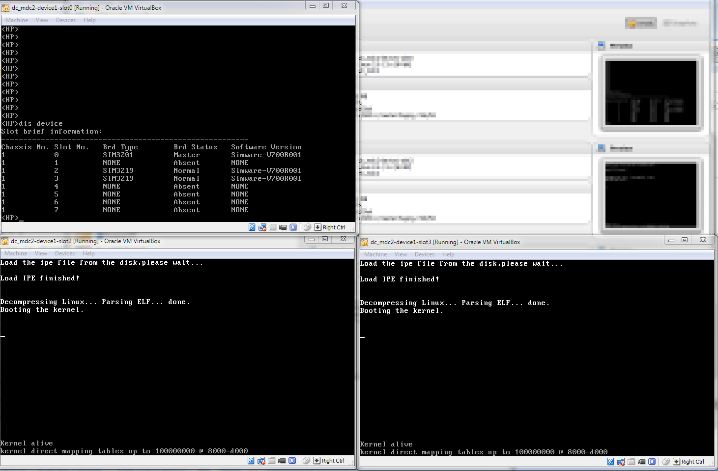 - Now you can start the VMs. The linecards (boards) will be VMs without CLI (obviously), so you could minimize them. The Slot 0 (the first MPU) has a normal CLI.